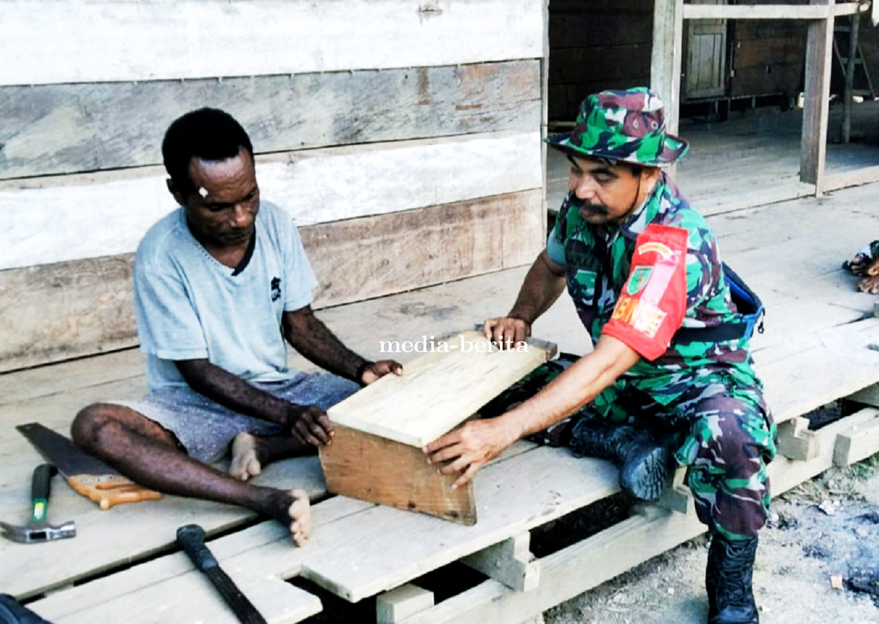 Keerom - Mengatasi kesulitan rakyat di wilayah binaan, Babinsa Koramil 1701-06/Web Sertu Majali membantu bapak Antonius Komon membuat keranjang untuk mengangkat barang bertempat di Kampung Embi, Distrik Web,