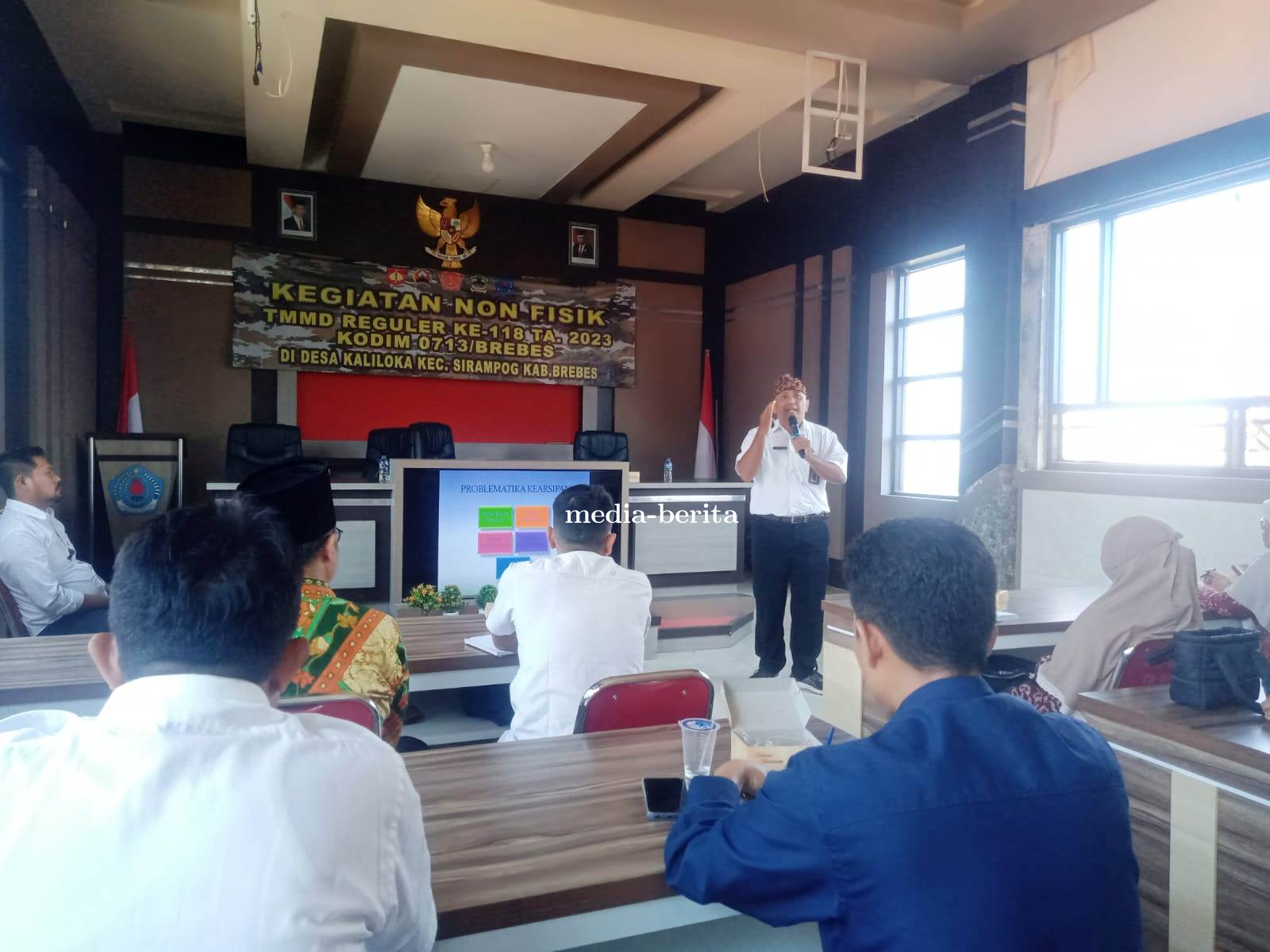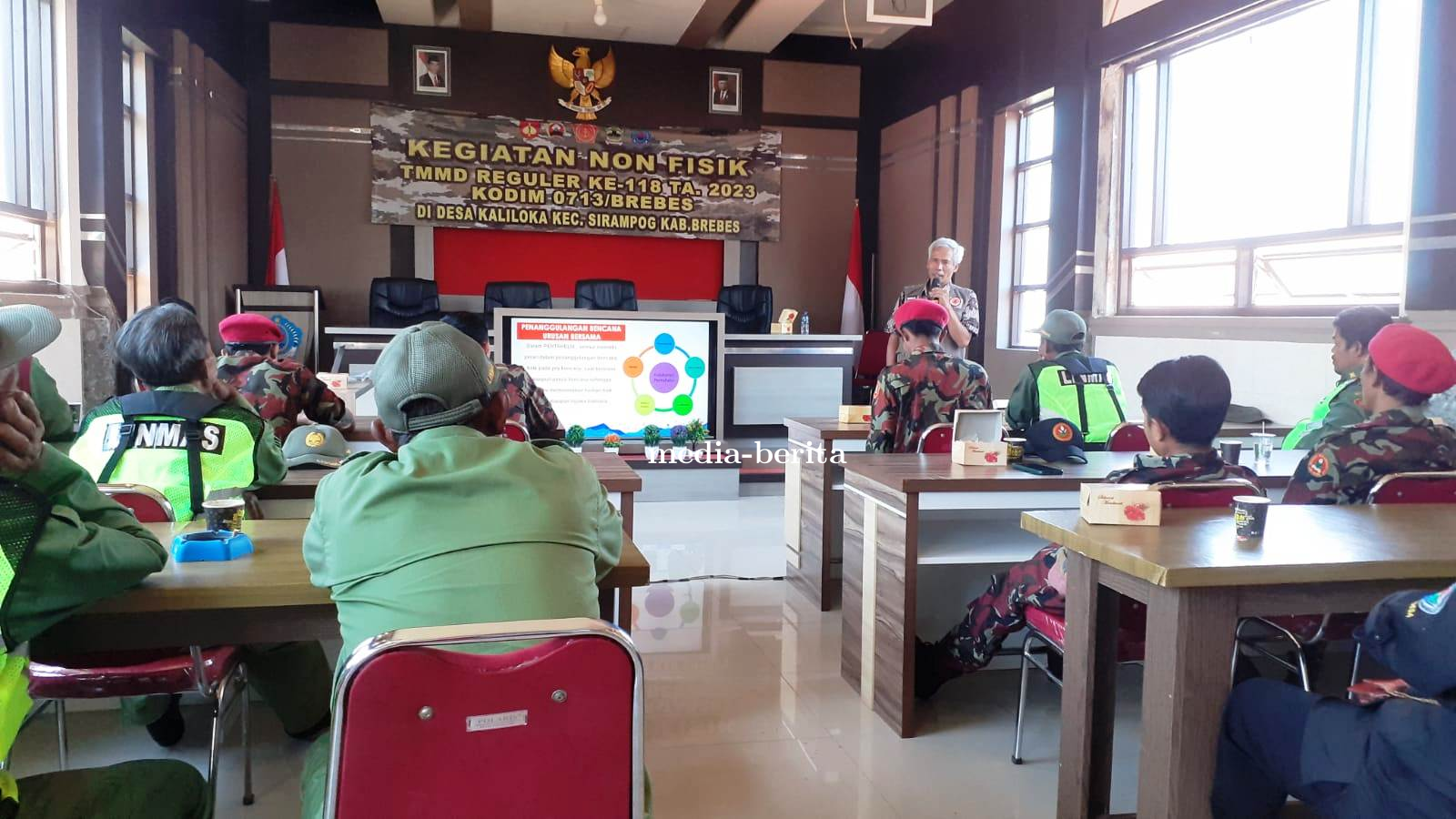 Brebes – Badan Penanggulangan Bencana Daerah (BPBD) Kabupaten Brebes mensosialisasikan upaya penanggulangan bencana alam di lokasi TMMD Reguler 118 Kodim 0713 Brebes, di Aula Balai Desa Kaliloka, Kecamatan
