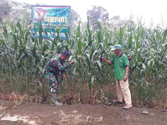 Banjarnegara - Bati Wanwil Serka Wahyono Wibowo bersama kelompok tani melakukan kegiatan pemantauan tanaman jagung untuk menjaga keberhasilan program swasembada pangan. Pengecekan tanaman jagung yang sudah berumur 74