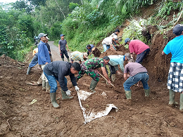 Babinsa Bersama Warga Bersihkan Jalan Akibat Longsoran Tebing