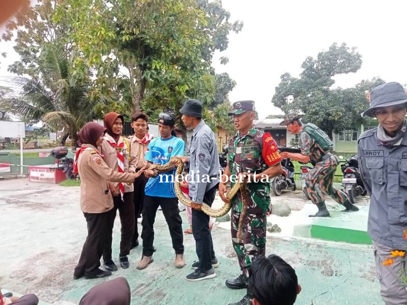 Brebes – Anak-anak pramuka binaan Koramil 02 Jatibarang Kodim 0713 Brebes atau Saka Wira Kartika (SWK) Jatibarang, menerima pembekalan animal rescue reptil dari Komunitas Exalos Indonesia Rescue Brebes. Minggu sore