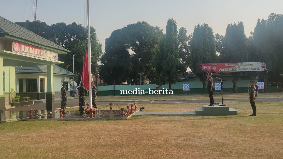 Tegal – Komando Distrik Militer (Kodim) 0712/Tegal menggelar upacara pengibaran bendera (mingguan) yang bertempat di Lapangan Upacara Makodim, Jln. Raya Pagongan Kecamatan Dukuhturi Kabupaten Tegal. Senin