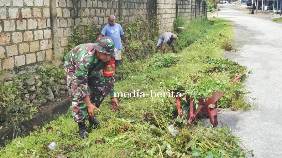 Sentani – Personel dari Batalyon Infanteri Teritorial Pembangunan 810/Beyea Emare Memare melaksanakan kegiatan kerja bakti membersihkan Puskesmas …